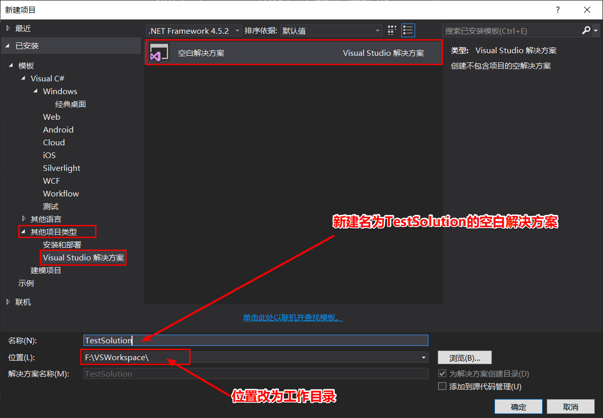 选择 其他项目类型—-Visual Studio 解决方案,在右边选择空白解决方案